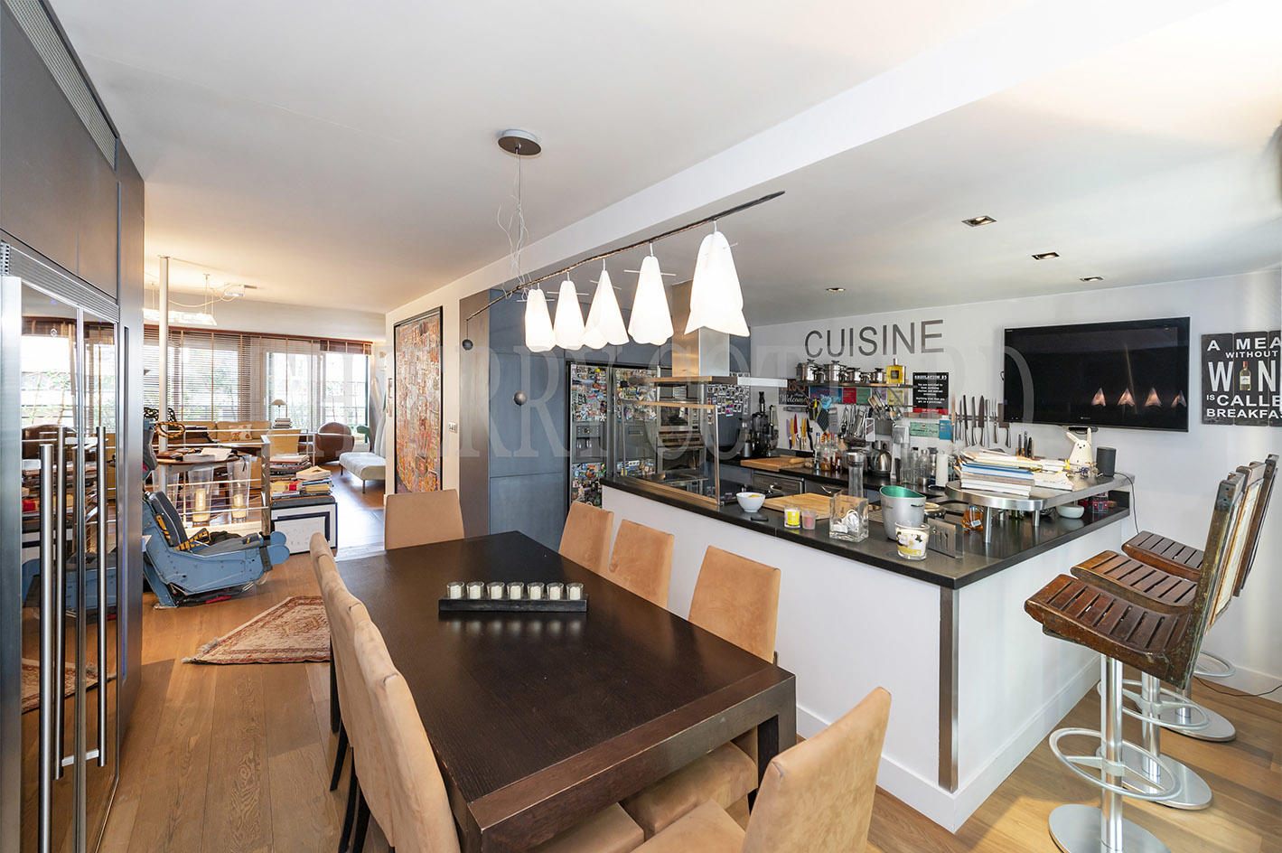 * un vaste espace composé, côté jardin au sud, d'un salon ouvrant sur un balcon et, côté rue, d'une salle à manger avec belle cuisine ouverte, aménagée et luxueusement équipée